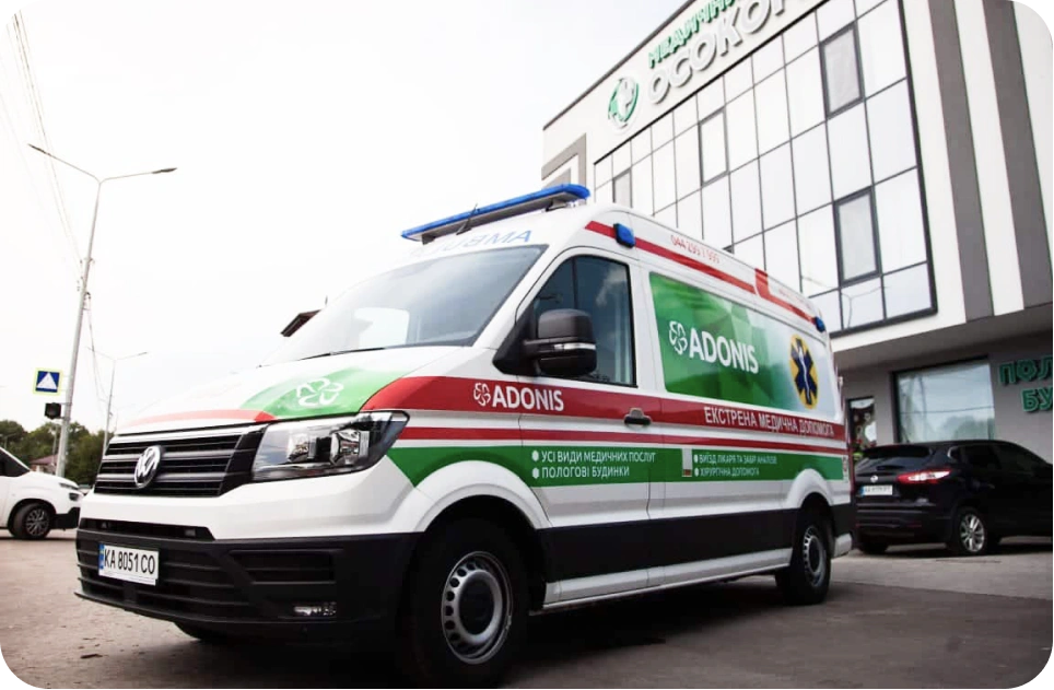Делает все возможное, заботясь о вашем здоровье и здоровье ваших близких. 4 современных автомобиля скорой медицинской помощи экстра-класса помогут нам быть рядом с теми, кто нуждается в помощи, вовремя. Бригады СМП ADONIS оказывают помощь всем категориям пациентов, в том числе новорожденным и детям в возрасте до 18 лет. К детям СМП выезжает на острые состояния, для транспортировки в Охматдет, ближайшую клинику или круглосуточный детский стационар ADONIS.